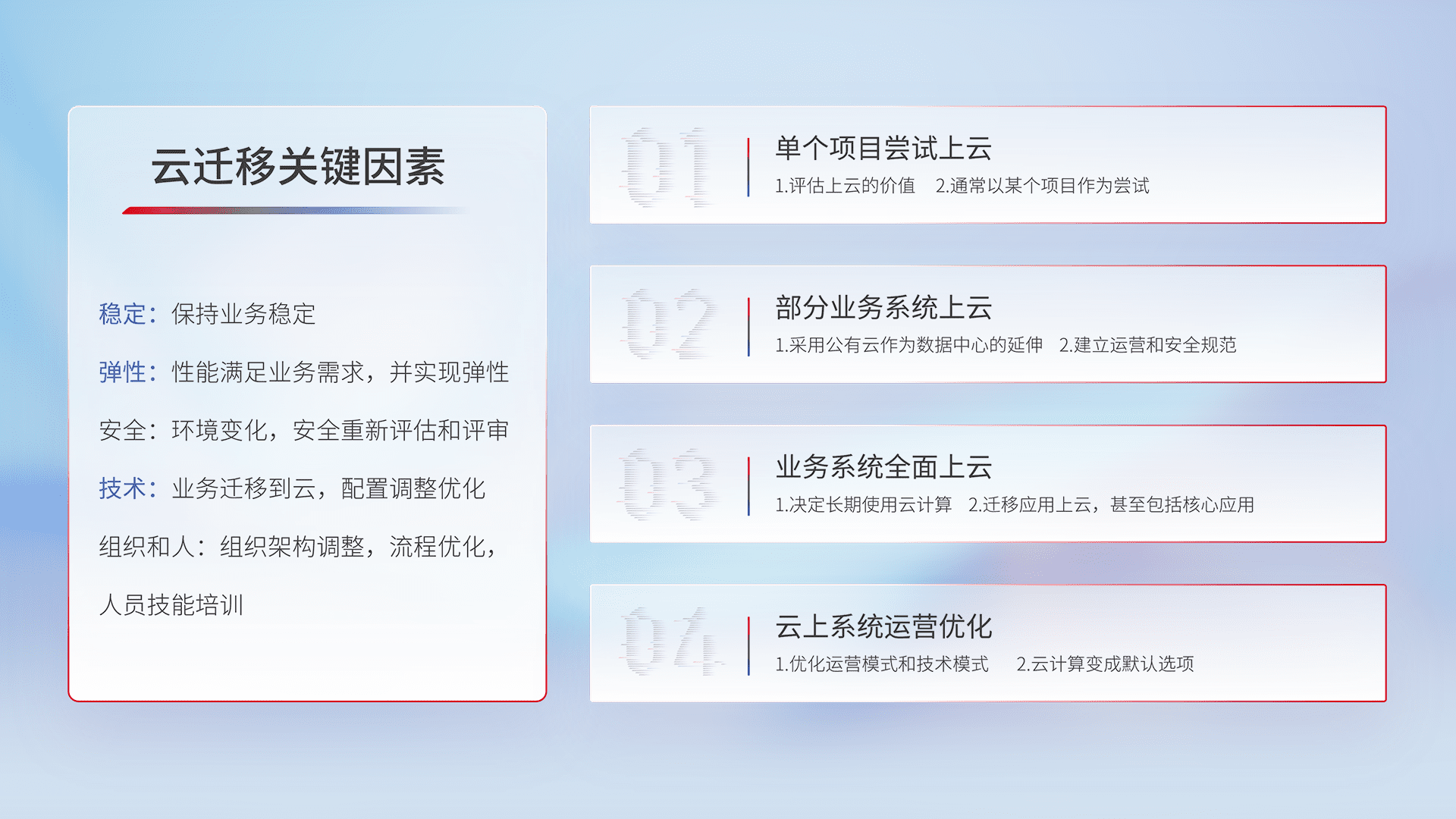 结合实际业务,,,从规划设计、、、、云平台选型、、云原生改造、、、、数据迁移、、集成交付,,迁移全过程为客户识别最佳上云路径,,,做好风险识别管理,,设计网络架构、、身份权限、、、安全审计合规、、操作审计、、日志审计、、、、监控告警策略、、、、多站点容灾设计等,,,,对云上基础设施进行整体规划,,,,提升IT治理水平,,,以满足弹性、、、、高可用、、高性能的需求。。。