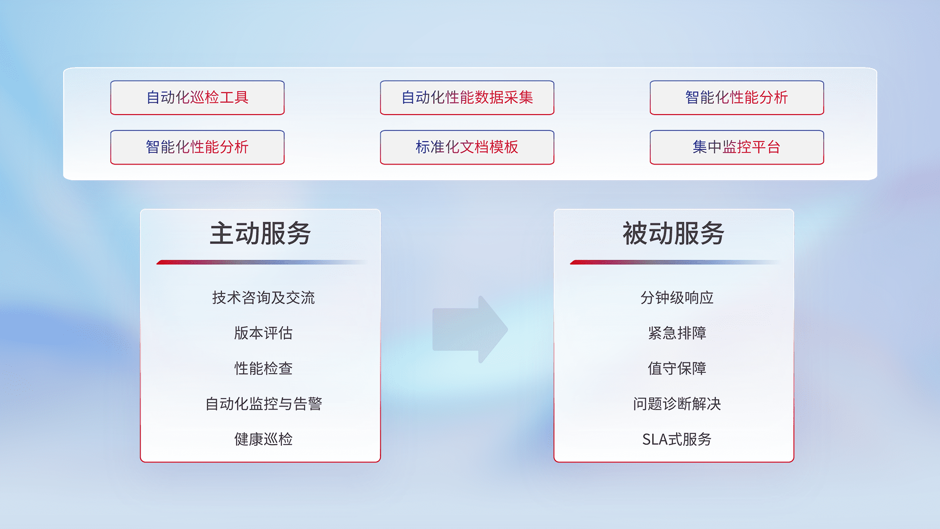 智能化工具和标准化文档,,保障服务质量,,提供主动服务(包含技术咨询、、版本评估、、、、性能检查、、、、自动化监控与告警、、健康巡检)和被动服务包含(分钟级响应、、、紧急排障、、值守保障、、、问题诊断解决、、SLA服务)。。。